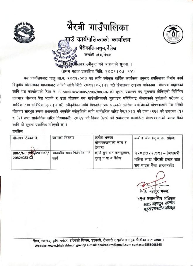 » बोलपत्र स्वीकृत गर्ने आशयको सूचना
