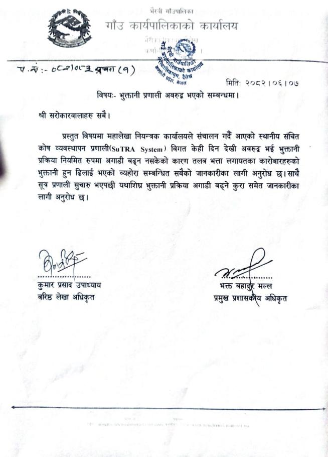 भुक्तानी प्रणाली अवरुद्ध भएको सम्बन्धमा ।