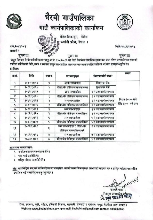 सामाजिक सूरक्षा तथा बाल पोषण बापतको भत्ता वितरण सम्बन्धी सूचना ।