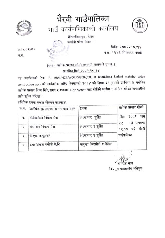 आर्थिक प्रस्ताव खोल्ने सम्बन्धी सूचना
