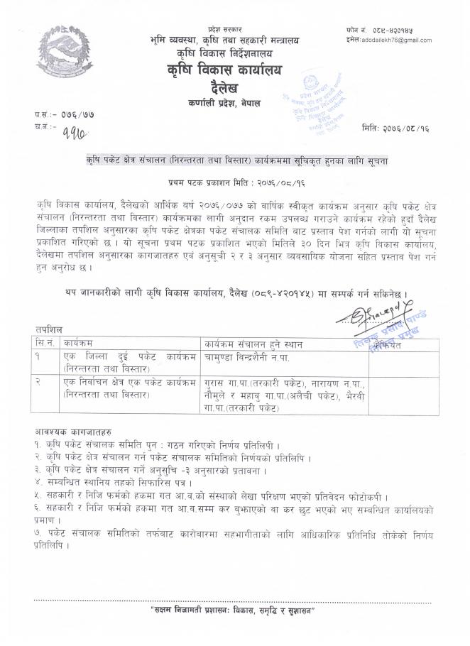 कृषि पकेट क्षेत्र संचालन (निरन्तरता तथा विस्तार) कार्यक्रममा सूचिकृत हुनका लागि सूचना । प्रथम पटक प्रकाशन मितिः २०७६/०८/१६