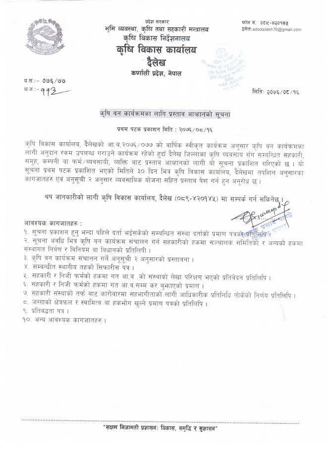 » कृषि वन कार्यक्रमका लागि प्रस्ताव आव्हानको सूचना । प्रथम पटक प्रकाशन मितिः २०७६/०८/१६