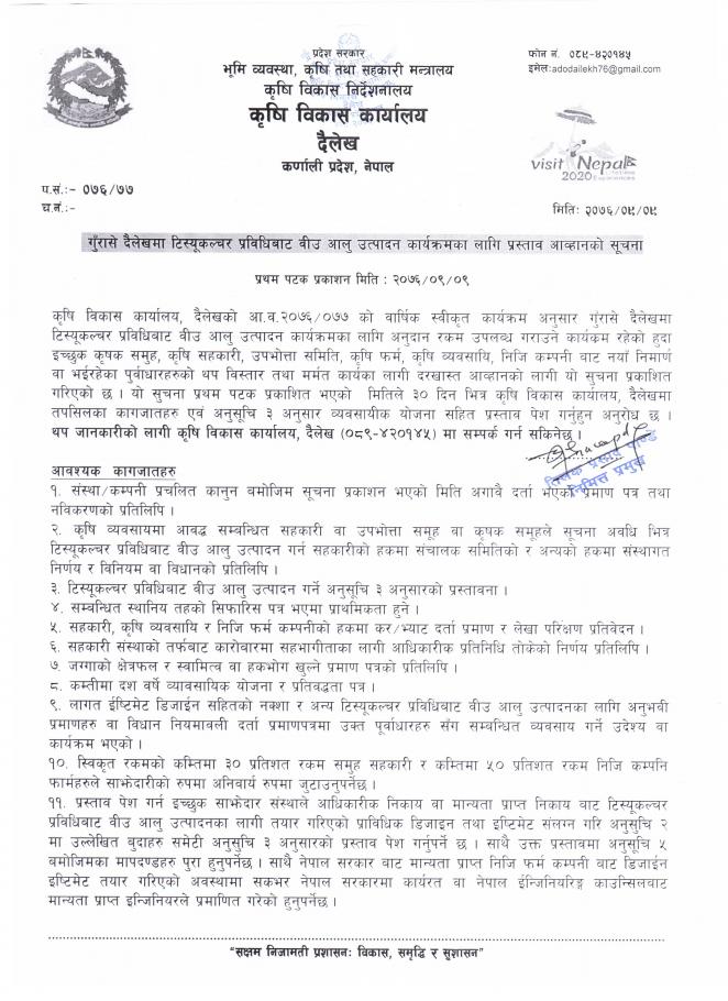गुँरासे दैलेखमा टिस्यूकल्चर प्रविधिबाट वीउ आलु उत्पादन कार्यक्रमका लागि प्रस्ताव आव्हानको सूचना ।