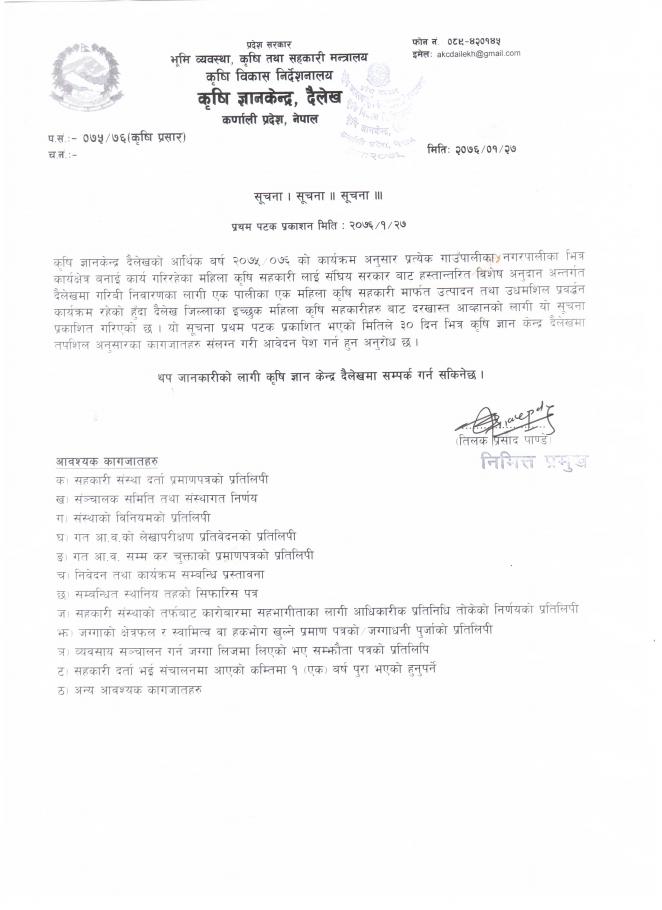 दैलेखमा गरिवी निवारणका लागी एक पालीका एक महिला कृषि सहकारी मार्फत उत्पादन तथा उद्यमशिल प्रवर्द्धन कार्यक्रम सम्बन्धी सूचना ।