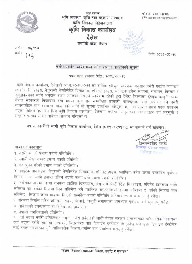 » नर्सरी प्रवर्द्धन कार्यक्रमका लागि प्रस्ताव आव्हानको सूचना । प्रथम पटक प्रकाशन मितिः २०७६/०८/१६