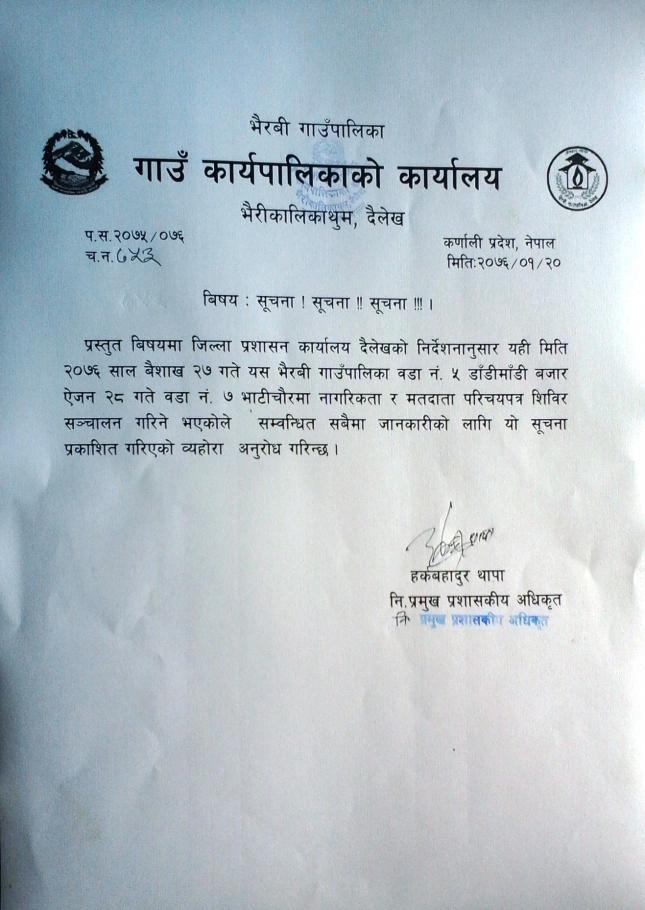 भैरवी गाउँपालिका वडा नं. ५ डाँडीमाँडी बजारमा २७ गते र वडा नं. ७ भाटीचाैरमा २८ गते नागरिकता र मतदाता परिचयपत्र शिविर सञ्चालन गरिने सम्बन्धी सूचना ।