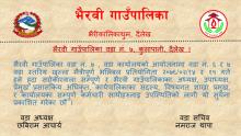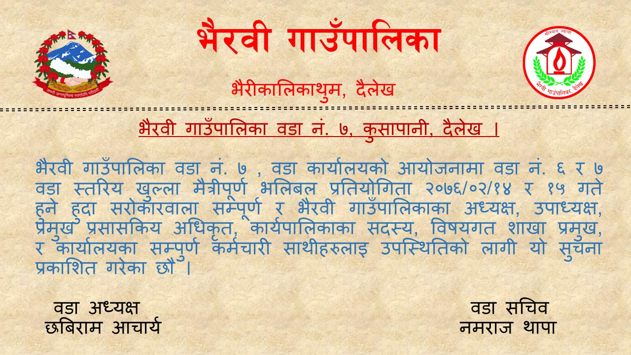 भैरवी गाउँपालिका वडा नं. ७ , वडा कार्यालयको आयोजनामा वडा नं. ६ र ७ वडा स्तरिय खुल्ला मैत्रीपूर्ण भलिबल प्रतियोगिता २०७६/०२/१४ र १५ गते हुने हुदा सरोकारवाला सम्पूर्ण र भैरवी गाउँपालिकाका अध्यक्ष, उपाध्यक्ष, प्रमुख प्रसासकिय अधिकृत, कार्यपालिकाका सदस्य, विषयगत शाखा प्रमुख, र कार्यालयका सम्पुर्ण कर्मचारी साथीहरुलाइ उपस्थितिको लागी यो सुचना प्रकाशित गरेका छौ ।