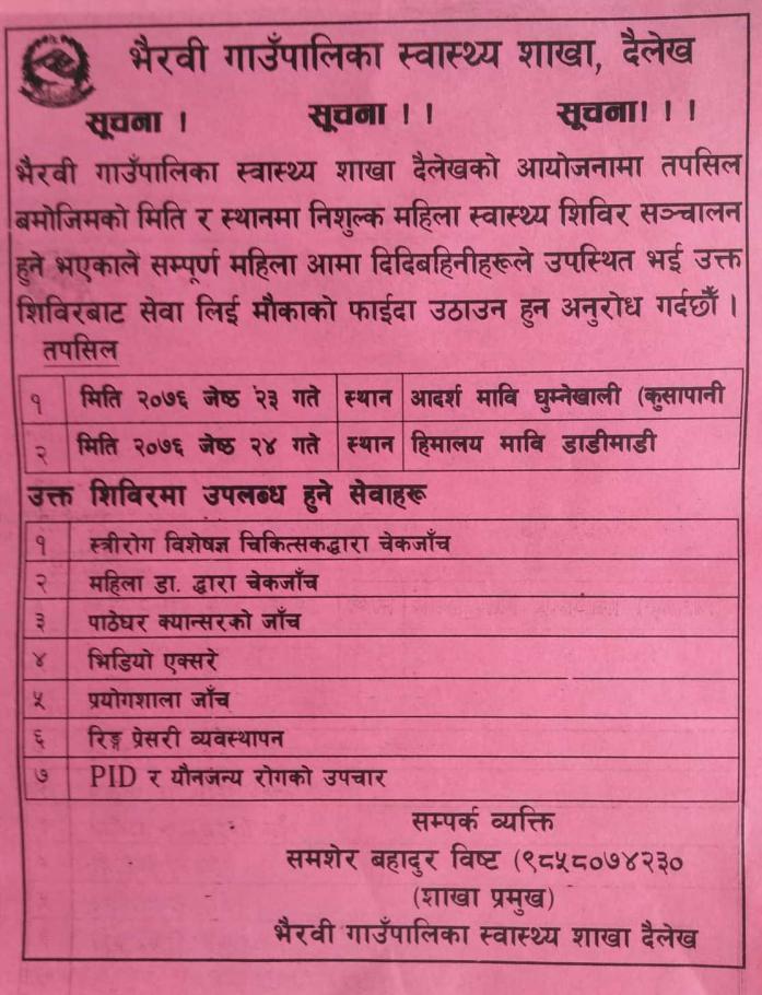 भैरवी गाउँपालिका स्वास्थ्य शाखा दैलेखकाे आयाेजनामा तपसिल बमाेजिमकाे मिचि र स्थानमा निशुल्क महिला स्वास्थ्य शिविर सञ्चालन हुने भएकाले सम्पूर्ण महिला आमा दिदिबहिनीहरुले उपस्थित भई उक्त शिविरबाट सेवा लिई माैकाकाे फाइदा उठाउन हुन अनुराेध गर्दछाैँ ।