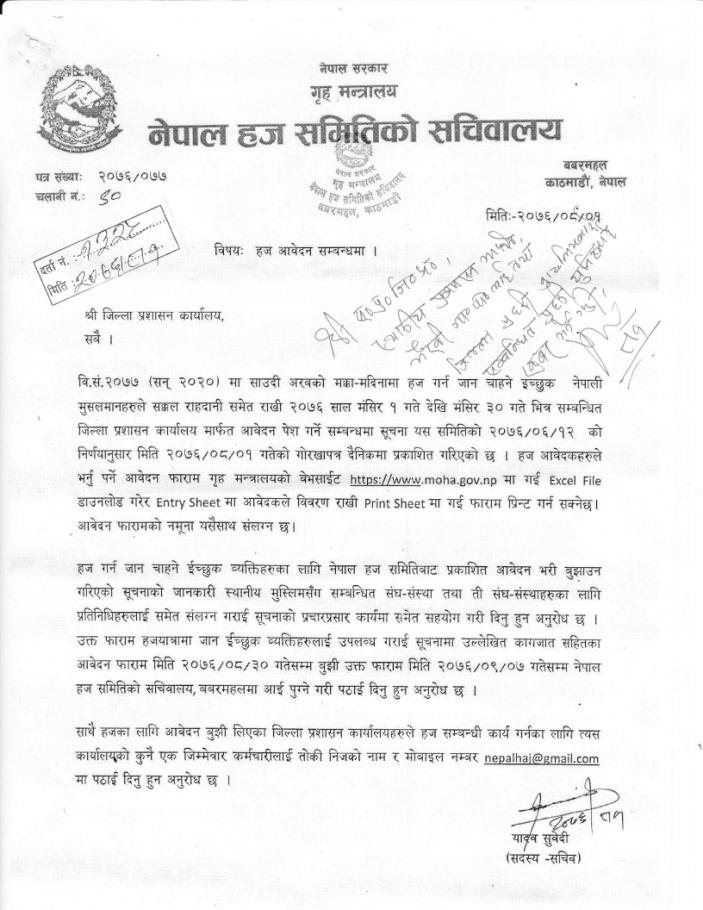 मुस्लिम धर्मावलम्बीहरुका लागि हज आवेदन सम्बन्धमा ।