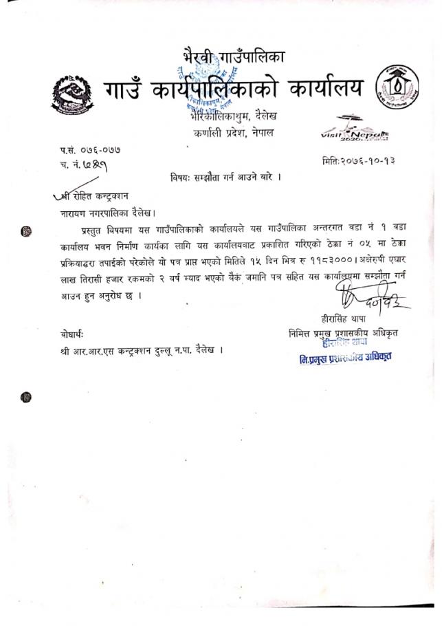 वडा नं. १ वडा कार्यालय भवन निर्माण कार्यका लागि सम्झौता गर्न आउने बारे ।