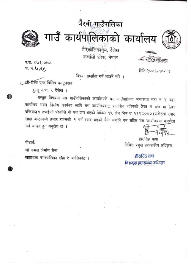 वडा नं. ४ वडा कार्यालय भवन निर्माण कार्यका लागि सम्झौता गर्न आउने बारे ।