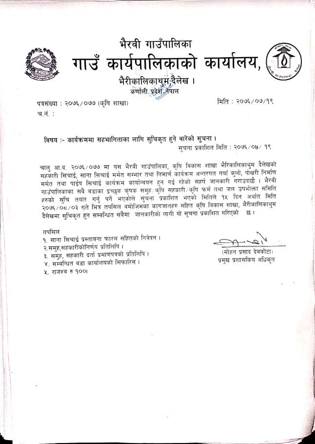 सहकारी सिचाई, साना सिचाई मर्मत सम्भार तथा निमार्ण कार्यक्रम अन्तरगत नयाँ कुलो, पोखरी निर्माण मर्मत तथा पाईप सिचाई कार्यक्रममा सहभागिताका लागि सुचिकृत हुने बारेकाे सूचना । (कृषि शाखा)