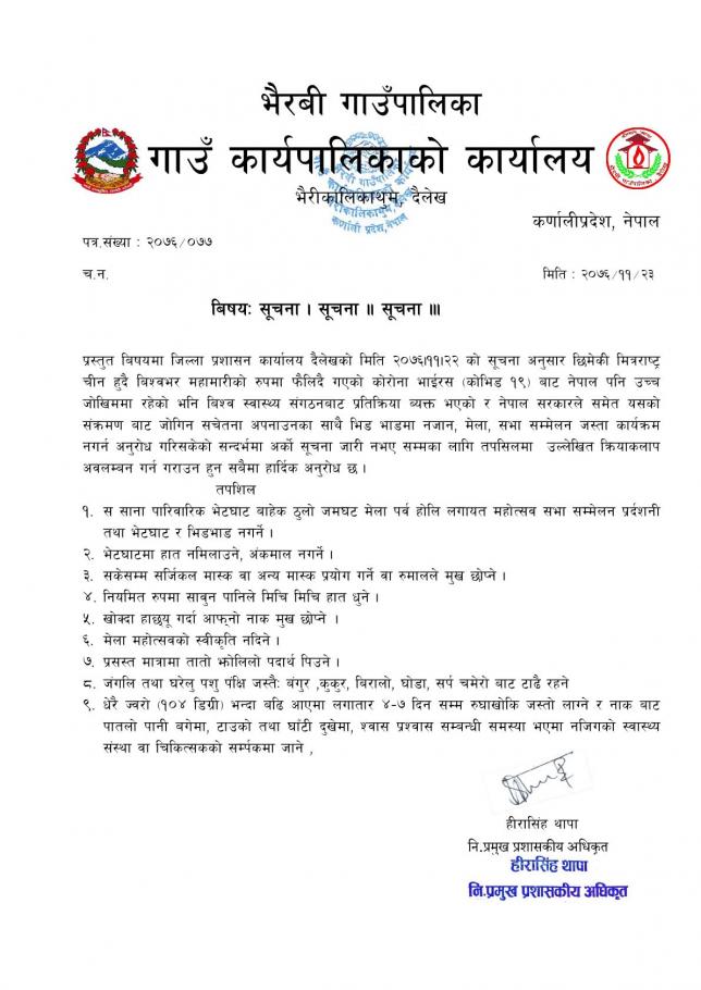 सूचना । सूचना ।। सूचना ।।। कोरोना भाईरस (कोभिड १९) संक्रमण बाट जोगिन सचेतना अपनाउन सम्बन्धी सूचना ।