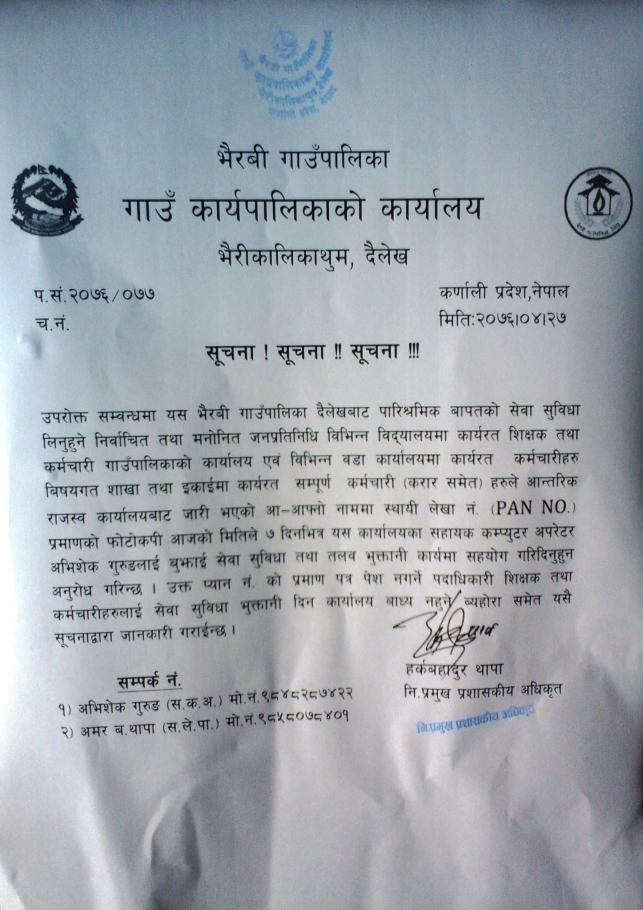 स्थायी लेखा नम्वर (PAN No.) प्रमाणकाे फाेटाेकपी आजकाे मितिले ७ दिन भित्र बुझाउने सम्बन्धी सूचना ।